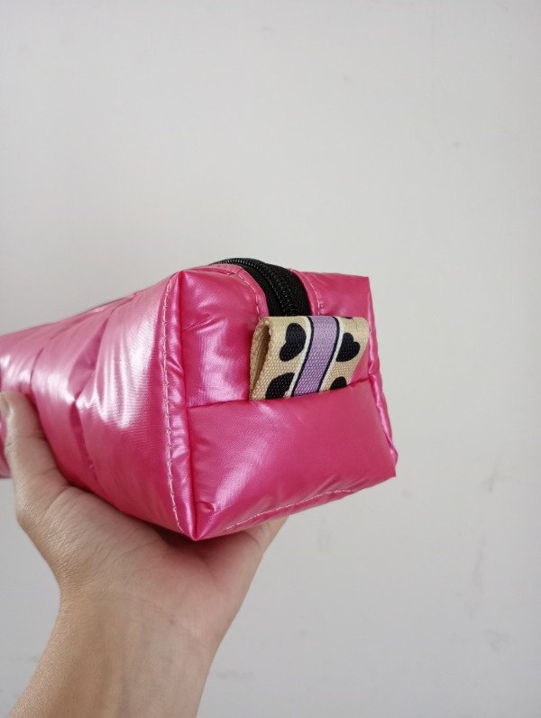 Cartuchera/neceser pufer fucsia metalizada/corazones STOCK