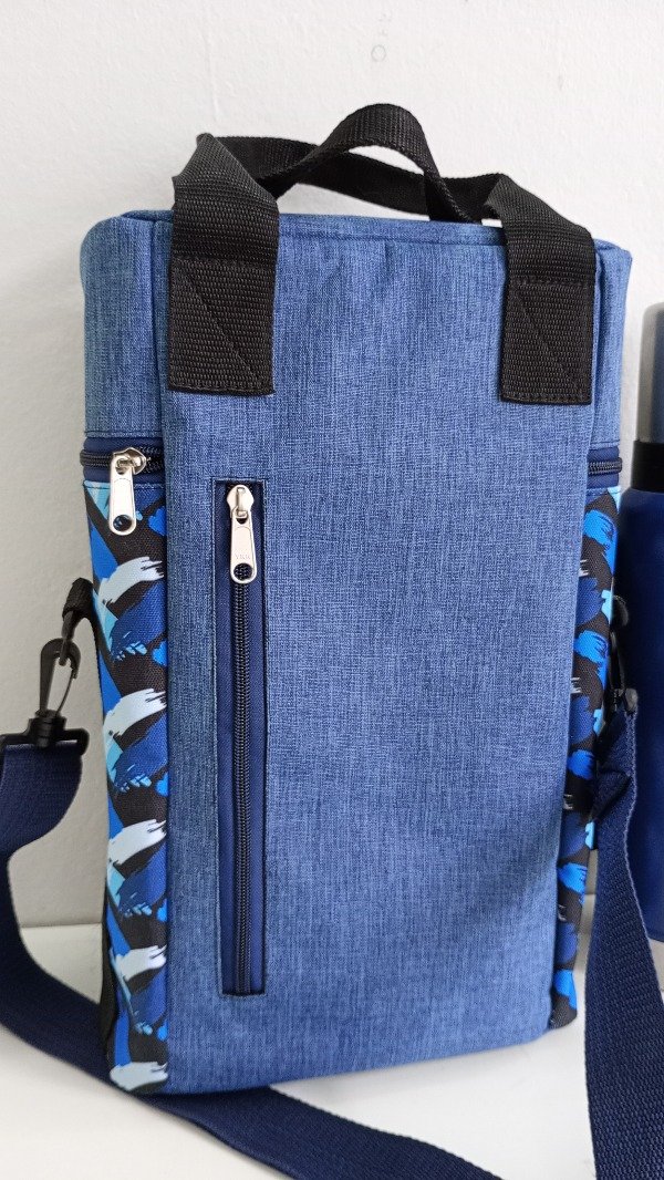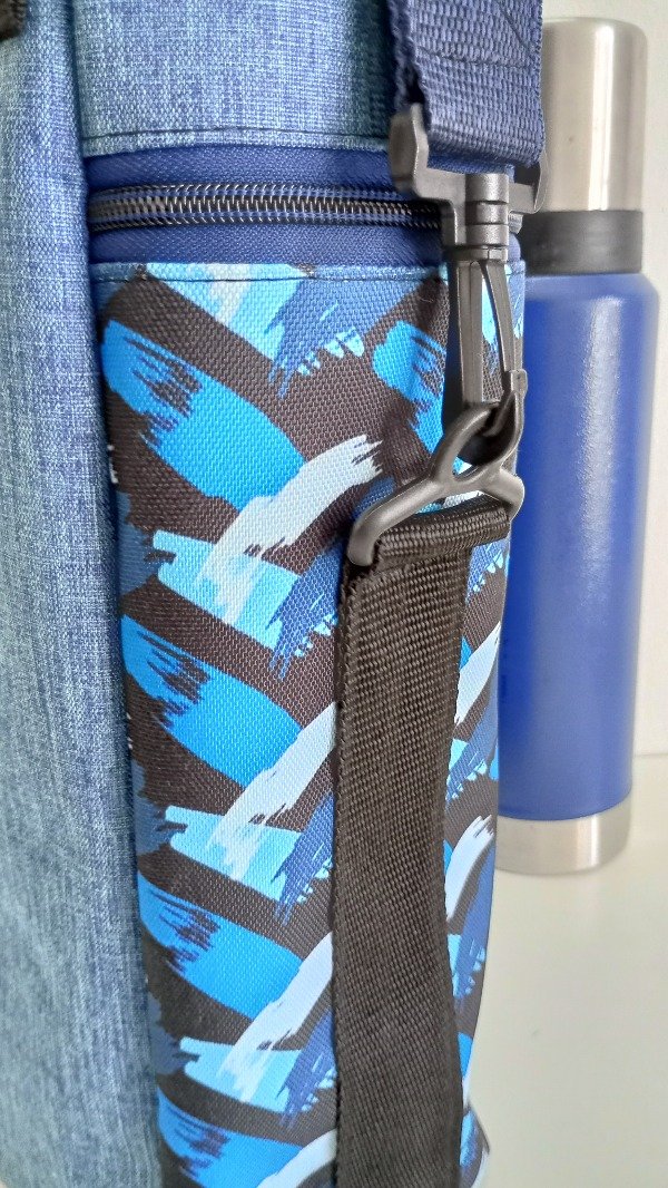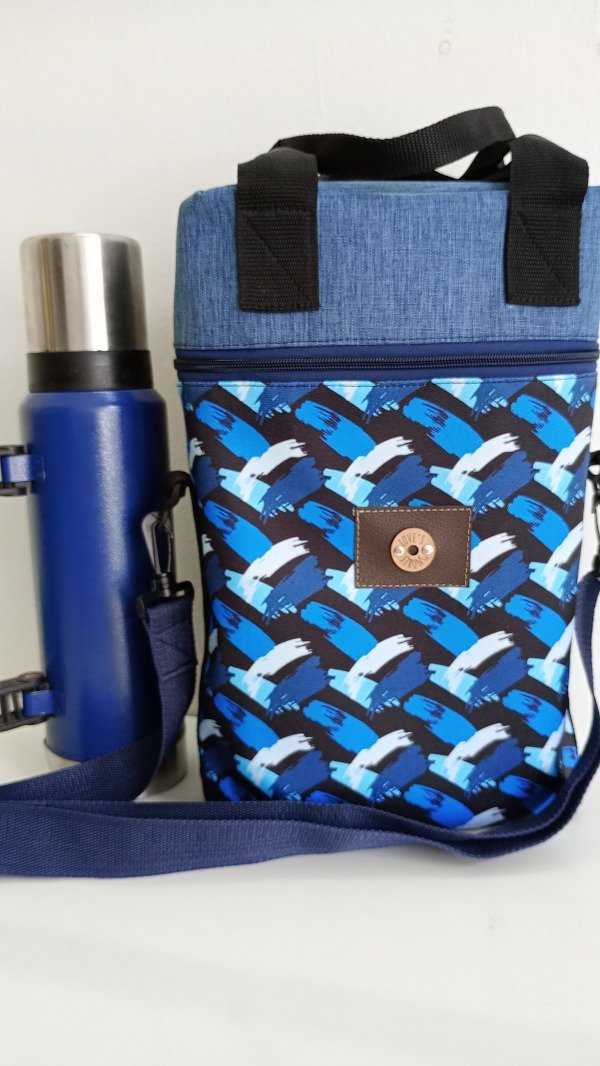 Realizado en cordura sublimada. Correa regulable y extraíble de cinta mochilera y mosquetones plásticos. Manijas de cinta mochilera. Bolsillo co cierre nexterno en la parte posterior Elástico para el termo.